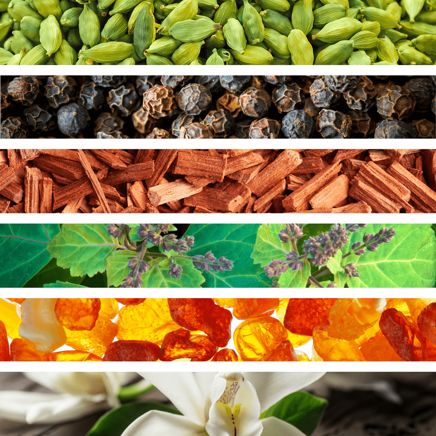 La fragrance vanille oud présente des notes boisées, des touches épicées de cardamome et de poivre noir, et un accord riche de bois d'oud, d'encens, de bois de santal, de bois de cèdre, de cuir, de patchouli et de vétiver.